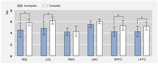 14]. The results showed that two regions, ROL and LOL, were significantly activated in the incomplete group, and that OL is crucial for processing visual information and plays an important role in the coordination of language, perception, and abstraction [
