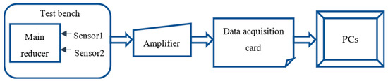 In this paper, a data acquisition test bench was used to collect the vibration signals in the actual environment. Through destructive experiments, the faulty main reducers with some particular failure modes such as tooth surface knock, tooth surface wear, and tooth surface bonding were obtained to ensure the repeatability of the collected signals. The test bench is shown in Figure 5a, and the sensors installment is shown in Figure 5b. In order to collect the vibration signal during the running of the main reducer more accurately, two acceleration sensors are placed in the lateral direction and the longitudinal direction of the main reducer as shown in Figure 6.