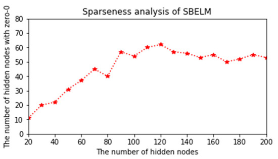 Using Formula (16), most of tends to infinity, and its corresponding weight tends to 0. The hidden layer nodes with a weight of 0 are deleted to achieve the sparseness of hidden layer nodes. With the sparse hidden layer weight vector , predict the probability of unknown sample using :