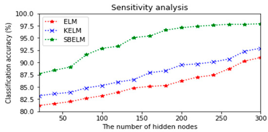 For the diagnostic model based on SVM, the regularization parameter C is set to 1.0, and the sigmoid kernel function is utilized in which the parameter γ is set to 1.0. The diagnostic model based on KELM uses the same parameter sets C and γ with a default value of 1.0. For the diagnostic model based on ELM, the optimal number of hidden nodes is searched in the range of 10 and 300 with the increment of 10.