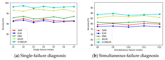 The performance of various diagnostic models is evaluated by using the testing set Dtesting which contains both single and simultaneous fault samples. The comparison results are listed in Table 5 and shown in Figure 9 in which H-SBELM represents the HMLC-SBELM-based model.