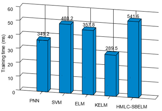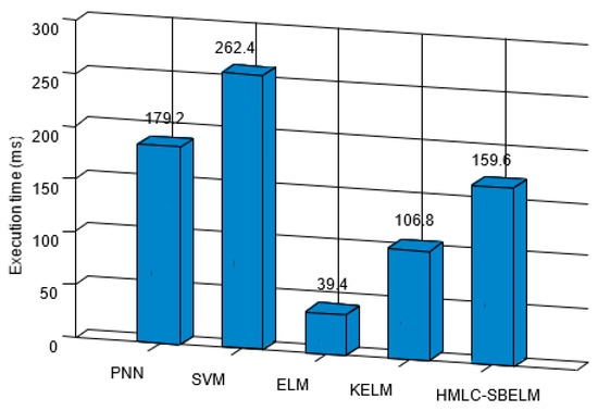 The time cost of classifying the testing set which is composed of 800 samples is shown in Figure 11. It indicates that the execution time of the HMLC-SBELM-based model is only 39.4 ms, which is nearly 4 times faster than other models. In practice, the execution time of a single sample is extremely small. The extremely fast execution speed of the HMLC-SBELM-based model is chiefly due to the minimum hidden layer scale obtained through the sparse Bayesian framework.