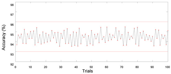 To further measure the stability and validity of the proposed intelligent diagnostic model based on HMLC-SBELM, the model was run for 100 trials. In each trial, the entire data set is shuffled and reassigned to obtain a diverse training set, v set, and testing set. The diagnostic accuracies of 100 trials are shown in Figure 12.
