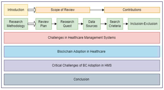 The structure of the review shown in Figure 1 is as follows: Section 1 gives an introduction, including the scope of the review and contributions of the paper. Section 2 presents the research methodology used for the review. Section 3 identifies challenges and loopholes in HMS. Section 4 provides a description of blockchain technology and the adoption of blockchain in healthcare. This section also proposes a BC-based solution taxonomy for HMS and a comparative analysis with traditional HMS. Section 5 highlights the critical challenges of BC adoption in HMS, and Section 6 concludes the paper.