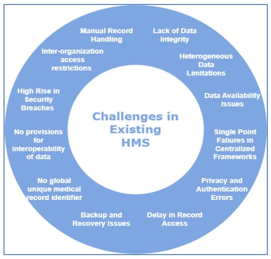 The healthcare sector suffers from many challenges, loopholes, and issues in various domains [36]. Based on related research work, this study identifies the various challenges in existing HMS depicted in Figure 4.