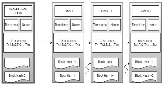 Blockchain architecture consists of decentralized peer-to-peer networks, hashing techniques, and consensus algorithms. A blockchain is a chain of blocks connected through the hash value of the previous block and so on [52]. A block stores information such as block index, time-stamp, nonce, block hash, previous block hash, and transactions [53,54]. Figure 6 gives an example of a simple blockchain. It comprises a distributed ledger of immutable transactions where every transaction is circulated to all the nodes in the peer-to-peer network [55,56]. The transaction is cleared when the nodes have agreed to acknowledge the new transaction into the distributed ledger [57]. Each block in the chain will have transactions T × 1, T × 2, … T × n, as shown in Figure 6.