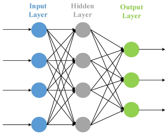 For nonlinear problems, back-propagation neural networks are often utilized to build the models [,,]. In this paper, a typical back-propagation neural network is employed to conduct the evaluation. The typical back-propagation neural network consists of a three-layer framework, i.e., input–hidden–output layer, as is shown in Figure 1.