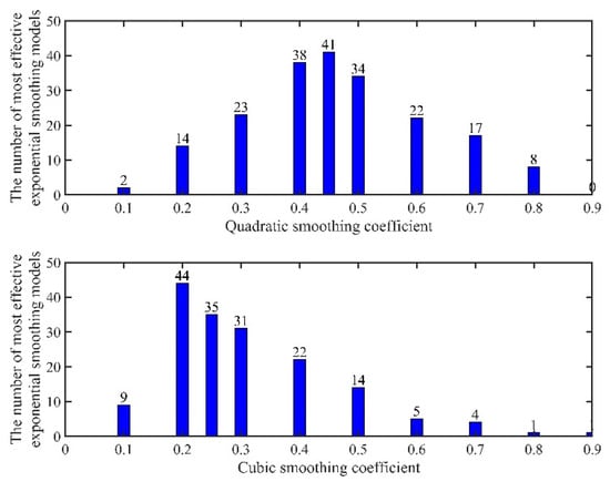 For the exponential smoothing models including quadratic exponential smoothing models and cubic exponential smoothing models, different values of the smoothing coefficients exert a tremendous influence on the predicted results. The most effective exponential smoothing model is determined by computing the MAPE of models under different smoothing coefficients. By setting the MAPE as 10%, the distribution of the number of most effective exponential smoothing models for airports under different smoothing coefficients is shown in Figure 3. For quadratic exponential smoothing models, when the smoothing coefficient is set as 0.45, the corresponding model is suitable for most airports under the given error. When the smoothing coefficient is set as 0.2, the corresponding cubic exponential smoothing model is suitable for most airports under the given error.