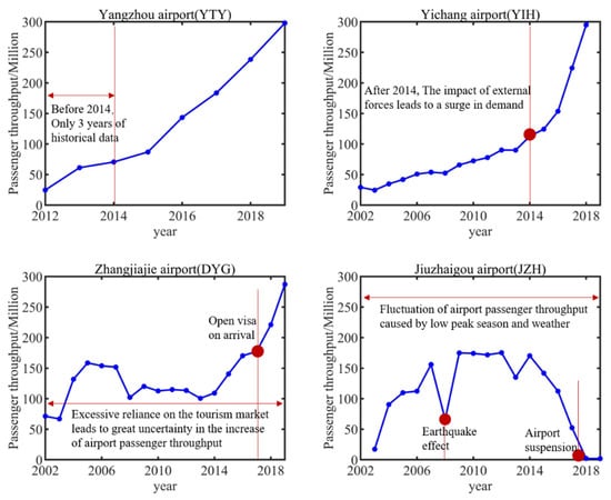 The applicability of the models on different levels of airports is shown in Table 3. The time series models are defined to be effective for an airport when at least one of the models is a good model under the given criterion. For the airports with APT of more than 10 million, 100% of the airports can be predicted effectively. Meanwhile, the time series models show poor applicability to airports with APT of less than 2 million. The criteria do not perform much influence on the predicted results. Considering the unavailability of the time series models, the airports with APT between 2 million and 10 million are studied in detail. There are only three airports that cannot be predicted by the time series models, which are shown in Figure 4. The Yangzhou airport (YTY) started running in 2012 and the little data make the models difficult to fit the observations well. The Yichang airport (YIH) is influenced by the Three Gorges Dam Project and its APT has shown explosive growth since 2014 when the Three Gorges Dam Project was opened to the public. The Zhangjiajie airport (DYG) develops depending much on the tourist industry. At first, the Zhangjiajie airport experienced a rapid expansion owing to the development of tourism resources. Then for a while, the Zhangjiajie airport was affected by the development of the high-speed railway. In 2017, after the visa on arrival was permitted, the APT of the airport returned to positive growth. For the airports with APT less than 2 million, 49 airports cannot be predicted by the time series models. Eighteen airports lack sufficient data. Eight airports suffer from data interruption because of expansion or relocation. The others are driven by external forces and show a lot of uncertainties like the Jiuzhaigou (JZH) airport.