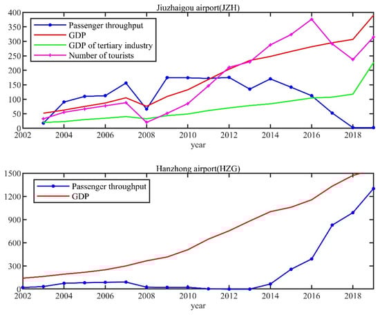 The data for the research can be divided into two types. One is the historical APT observations, which can be obtained from the Civil Aviation Administration of China (CAAC, http://www.caac.gov.cn/en/SY/ (accessed on 22 August 2022)). The other one is the indicators of economic development, which contains gross domestic product (GDP), GDP of primary industry, GDP of secondary industry, GDP of tertiary industry, resident population, year-end population, urbanization rate, imports and exports, disposable income, total retail sales of consumer goods, tourist visits and tourism income. The data can be obtained from the National Bureau of Statistics of China (NBSC, http://www.stats.gov.cn/english/ (accessed on 22 August 2022)).