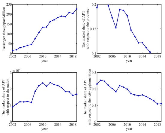 For all 203 airports, each airport is located in a city without other airports except in the cities of Beijing, Shanghai and Chengdu, which means that for most of the airports, the market shares of the airports are the same as the market shares of the cities when using the market share method. The market share methods can be used to calculate the APT of airports accounting for the province’s market share, the APT of airports accounting for the nation’s market share, as well as the APT of airports accounting for the city agglomeration’s market share. Since the 19 city agglomerations in China only cover 121 airports, the corresponding method is suitable for 121 airports. The market shares are fitted by using the time series models and the evaluating results are shown in Table 12.