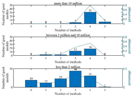 For different levels of airport, all airports with APT of more than 10 million can be effectively predicted under arbitrary criteria with the five-model hybrid method. Regardless of the Zhangjiajie airport (DYG), all the airports with APT between 2 million and 10 million can be effectively predicted under Criterion 1. Under Criterion 2, all the airports with APT between 2 million and 10 million can be effectively predicted. For the airports with APT less than 2 million, 85% of the airports can be effectively predicted. By comparing the number of good models for each airport shown in Figure 8, there are usually more than three good models for the airports with APT of more than 10 million under Criterion 3. For the airports with APT between 2 million and 10 million, there is at least one good model. The applicability of all the models is promoted with the increasing APT. The applicability of all the models on different levels of airports is shown in Table 18. It reveals that large airports with high APT usually have high prediction accuracy with the hybrid evaluating method. Airports with low APT are hard to be predicted with the promoted hybrid evaluating method.