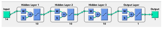 In this study, we created a neural network with three hidden layers containing ten neurons based on the 14 input attributes. The constructed neural network is shown in Figure 2.