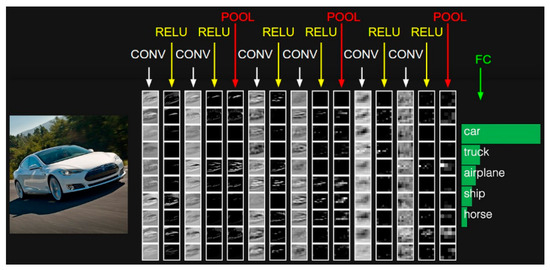In Figure 4 below, CONV is the convolution calculation layer, RELU is the excitation layer and an activation function, POOL is the pooling layer, and FC is the fully connected layer. Using the convolutional neural network model [25], the vehicle image was input into the neural network as a training set and the neural network parameters were corrected by multiple trainings [26]. Finally, a neural network model that could recognize the car picture was obtained.