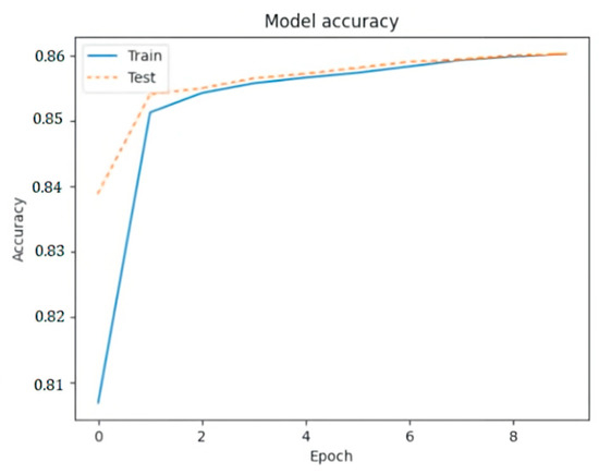 During the training of the neural network model, the parameters of the training model were first imported, including the preset model, learning rate, number of training, training set, and validation set data. The results of each training were kept using checkpoints, the training results were detected using early stop, the patience value was set to 4, the verbose value was set to 1, and the training was stopped when the model reached the optimal solution to prevent overfitting. Figure 7 illustrates the excellent accuracy of lane recognition in this experiment, which had an accuracy of 86.02%. To avoid overfitting, the training was stopped when the model reached the optimal solution. To avoid memory usage, the compiled neural network model was compiled using the fit generator block to read the data into memory. The VNC trained the neural network model program in the background and sent the generated model to the Raspberry Pi tensor flow system for processing after the operation. For unmanned patrol, the car could be driven on a pre-defined track.