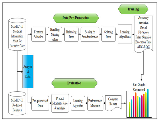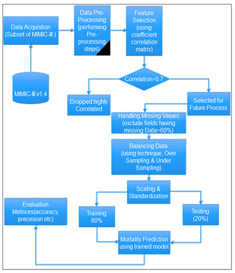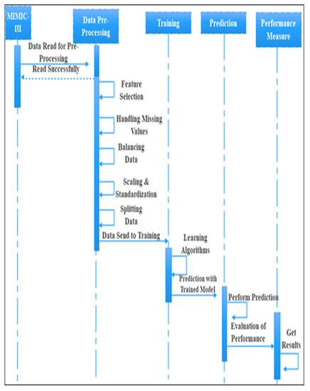 This section presents the details of the proposed framework. To build the model for mortality prediction machine learning algorithms are used. The MIMIC-III dataset is used for validation. Initially, pre-processing is performed on the data then the dataset is reduced to normalized form. The missing values are replaced with the mean value. Under-sampling is performed on the discharge and deceased record after which the BMI is calculated. Based on these steps and with the required vital features the death rate and the live patients are calculated. After this, the training and testing are performed on the data with the ratio of 20/80. The different algorithms of machine learning are used to find out the evaluation metrics and the results of various algorithms of machine learning are compared to find out the best accuracy and efficient time performance. The steps involved in the proposed prediction model are shown in Figure 1. Figure 2 shows the sequence of activities involved in the proposed model.