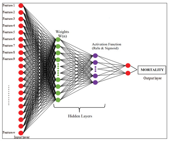 We select the model parameters using a set of validation with the best model of performance. While the set of testing evaluates the performance of the model and evaluation of results. Training of the model is performed by the training set. For performing these experimentations, the vital predictors from the MIMIC dataset are used to predict the mortality rate with better accuracy. These vital input predictors are , , , , oasis, , sapsii, , intime, , specimen, gender, and intubated on which the prediction is performed. Different algorithms of machine learning are used for prediction based on the evaluation metrics selected. The experiments have been completed with various arrangements of batch sizes, and the number of epochs to select the best parameters and hyper-parameters for the proposed model. We have applied sigmoid and Relu activation functions in the experiments. Linear activation has been used in the output layer while sigmoid is used in the hidden layer.