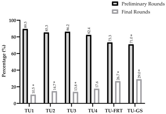 The data were even clearer in the analysis carried out by grouping the competition rounds, similar to Adam et al. [12]. When grouping in PR and FR, there was an underrepresentation of TU1-BRT, TU2-BRT and TU3-BRT in PR and an overrepresentation of TU-FRT and TU-EXT contests in FR, indicating that the contests of higher performance level facilitated the appearance of longer contests. Despite differences in rules (e.g., yuko score and 5 m of regular time), the data were consistent with another study conducted at WC14 and WC15 [12]. When considering the sex categories, data of overrepresentation during TU-FRTs were not found for women, suggesting differences in managing the contest. The relationships between WhCE, TUs and rounds should be also taken into consideration in training. This is because the probabilities of ending in a particular BRT, FRT and EXT contest or TU while considering the round should also guide athletes’ tactical and strategic decisions in their training and inform physiological needs, such as aerobic and/or anaerobic capacity or the capacity to maintain strength over time [27].