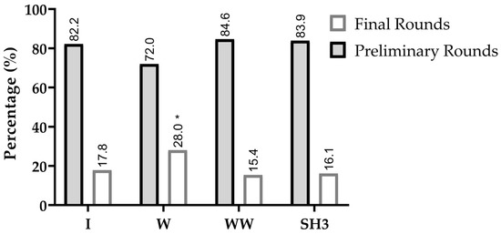 Figure 2 shows the association between HwCE and the grouped rounds (PR and FR). In this regard, the chi-square analysis for the whole sample showed an association between HwCE and the rounds grouped (p < 0.001; V = 0.119). The SR showed an underrepresentation of W in PR (−2.2) and an overrepresentation of W in FR (4.5). When men (n = 1387; p < 0.001; V = 0.141) and women (n = 953; p = 0.011; V = 0.108) were analysed separately, an underrepresentation of W was observed during PR for men (−2.0), and an overrepresentation of W was observed during FR (4.2). For women, an overrepresentation of W was only observed during FR (2.3).