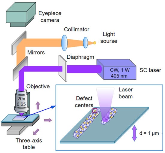 In the mode of irradiation with continuous radiation of a semiconductor laser, the central part of the laser spot was diaphragmed, after which the radiation was focused by a lens with a magnification of 20× and a numerical aperture of NA = 0.65. The sample with the film was fixed on a three-coordinate table, Thorlabs MTS50/M-Z8 (Figure 1), and processing was carried out in the focal plane of the lens. An ocular camera was used to visualize the irradiation zone, and the sample was moved into the image plane of the lens. The power density of the laser radiation acting on the film ranged from 0.74 to 1.09 kW/cm2, with a spot diameter of about 30 μm. The intensity profile in the cross-section of the laser beam hitting the film was flat on top (top-flat). The film structure was modified at a laser spot scanning speed of 1 mm/s.