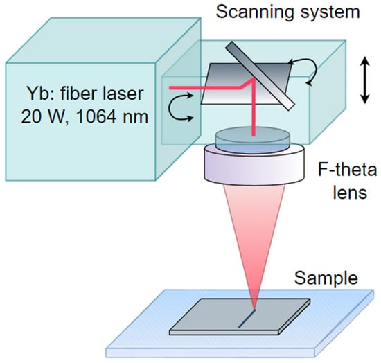 To modify the film structure with NIR laser pulses, a two-mirror galvanometric scanner was used to ensure spot motion along a given trajectory. After the scanner mirrors, the laser beam was focused by an F-theta lens with a processing field of 100 × 100 mm (Figure 2). The films were processed in the F-theta lens focal plane. The maximum power density of the laser radiation incident on the film in a laser spot with a diameter of about 50 μm reached 1.45 kW/cm2 with a pulse duration of 4 ns to 20 ns and a pulse repetition rate of 5 kHz to 50 kHz. The laser spot velocity varied from 13 to 120 μm/s.