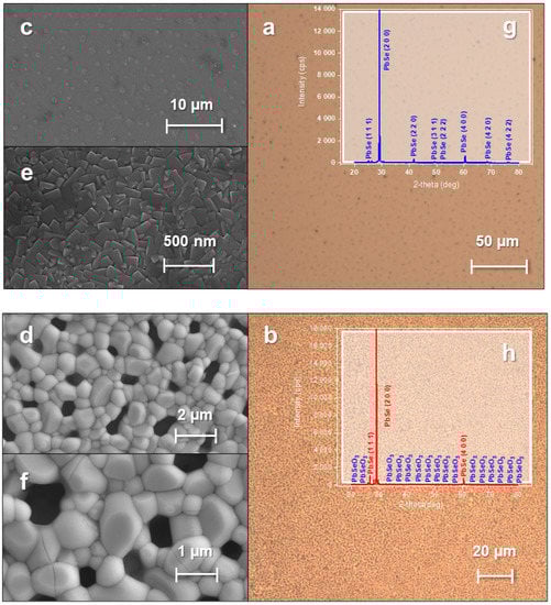 Images of a PbSe film obtained using optical microscopy in bright field reflected light: (a) initial film; (b) film after heat treatment. Pictures of the PbSe film obtained with the SEM secondary electron detector: (c,e) initial film; (d,f) film after heat treatment. A picture of the PbSe film obtained using an X-ray diffractometer (g) initial film; (h) after heat treatment.