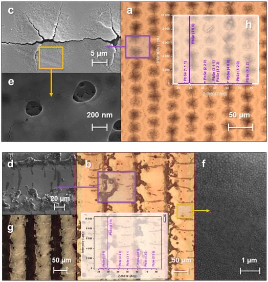 Images of a PbSe film obtained using optical microscopy: in a bright field of reflected light, (a) darkening mode when modified by pulsed radiation, (b) bleaching mode when modified by pulsed radiation; in the transmitted light field (g), the bleaching regime upon modification by pulsed radiation. Pictures of the PbSe film obtained with the SEM secondary electron detector: (c,e) darkening mode when modified by pulsed radiation, (d,f) bleaching mode when modified by pulsed radiation. Pictures of the PbSe film obtained using an X-ray diffractometer: (h) darkening mode when modified by pulsed radiation, (i) bleaching mode when modified by pulsed radiation.