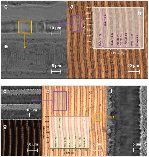 Optical characterization was carried out, and the PbSe film structure subjected to laser treatment in the darkening mode was studied. As a result of the laser exposure, periodic structures were formed in the track’s central part, which were local hills, since during the melt pool formation, material was periodically drawn into the heat source center, limited by the laser spot. The sample modification did not entail the damage formation in the scanning area and also did not change the original film properties located between the tracks, but it caused melting and contributed to the molten material redistribution. In the laser exposure zone, one can observe the presence of dark and light ridges, which are characterized by different material densities. More dense areas—light ridges—are formed due to the material redistribution and the neighboring dark area depletion of the track, respectively. As in the case of heat treatment in a furnace, a crystal structure is formed at the track periphery due to laser action. However, when laser radiation is used, the formation of an oxide phase is absent. This feature is an advantage since the presence of oxide can contribute to the film’s degradation and reduce its service life. Moreover, when the film was rescanned in the mode in which darkening was observed, the film was clarified (Figure 5b).