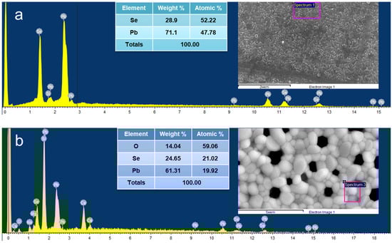 The FESEM image of two films before and after heat treatment is shown in Figure 6a,b. The pictures clearly show the formation of oxide after heat treatment. The presence of constituent elements, such as O, Se, and Pb, in two films is shown in Figure 6a,b.