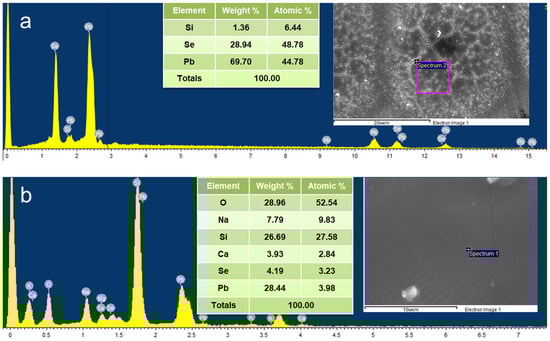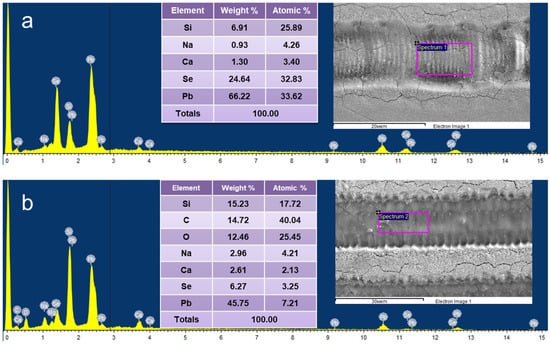 Chemical elements, except Pb, Se, and in some cases O, that is, elements such as Si, Na, Ca, etc. (Figure 7 and Figure 8) belong to the elementary composition of the cover glass—the film substrate. The reason for the detection of these elements is their destruction, including the cracking of the film under the action of laser radiation and the further removal of these elements to the surface of the samples.