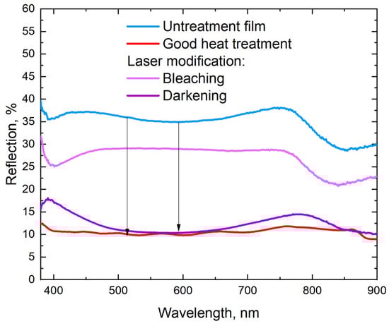 Figure 9 shows the reflectance spectra for samples that have undergone various processing types. The smallest reflection, almost over the entire measured wavelength range, was observed for the samples subjected to thermal treatment in the furnace, which is associated with the formation of a surface-transparent oxide. For PbSe films modified in sections using short laser pulses in the darkening mode, a sharp decrease in reflection was observed relative to the initial film but more so relative to heat treatment. However, in the exposure case to continuous laser radiation at a wavelength of 405 nm in the darkening mode, the reflection was less important than during heat treatment, and the modified regions approached a black body in their optical properties [].