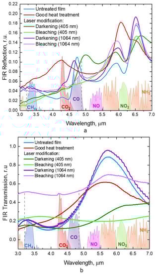 Fourier spectra of (a) reflection (excluding the film substrate) and (b) transmission (taking into account the film substrate) obtained for samples subjected to various treatments: initial sample (blue curve), sample after heat treatment (red curve). Sample after laser modification in the darkening mode modified by continuous radiation (dark green curve), a sample after laser modification in the bleaching mode modified by continuous radiation (light green curve), a sample after laser modification in the darkening mode modified by pulsed radiation (violet curve), a sample after laser modification in the bleaching mode modified by pulsed radiation (light violet curve). Absorption spectra of various gases (CH4, CO2, CO, NO, NO2, NH3).