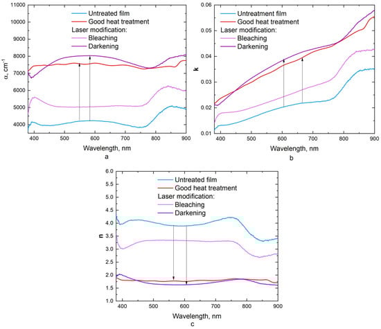 Figure 11 shows the calculated optical constants of the untreated film and the film after laser modification. As a result of film laser modification, a decrease in the refractive index and an increase in the absorption coefficient and extinction coefficient were observed. Since the greatest increase in absorption was observed after laser treatment in the darkening mode, the extinction and absorption coefficients, which characterize the material absorbance, have the highest values for samples after laser modification during darkening. As a result of the photothermal action on the film with a high temperature gradient, the valence boundaries and conduction bands shifted, which affected the optical characteristics modification discussed above.