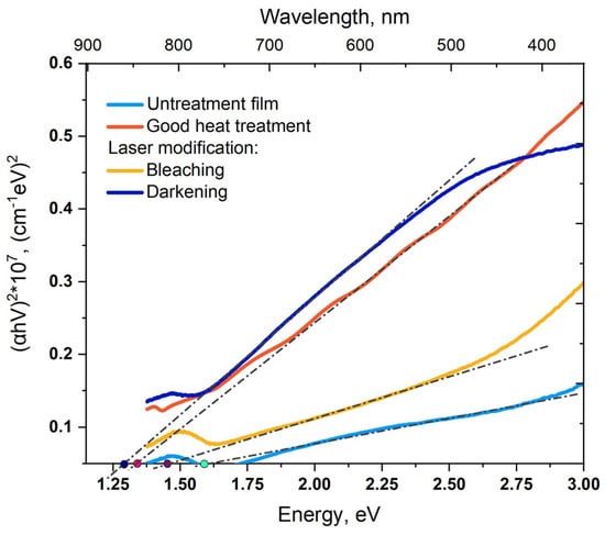 The PbSe film band gap was also determined before and after laser and heat treatment. By extrapolation of two straight sections, the following values were determined: untreated sample Eg = 1.59 eV, after laser modification on wavelength 1064 nm in the bleaching mode Eg = 1.45 eV, after heat treatment Eg = 1.33 eV, and after laser modification in the darkening mode Eg = 1.30 eV (Figure 12). In the authors’ previous work [], PbSe films, after modification by continuous radiation with a wavelength = 405 nm, had a band gap value in the darkening mode of Eg = 1.33. Since the Eg shift is fairly easy to achieve, some research groups [,] shift the band gap from intrinsic 0.27 eV to 1.8 eV, which corresponds to wavelengths of 4.6 µm and 690 nm, respectively. Thus, the band gap values obtained are in good agreement with the previously published results [,].