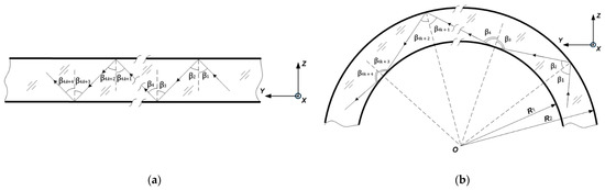 Slanted rays that lie neither in the sagittal nor in the meridional planes will propagate along such a trajectory that its projections on these planes will correspond to those depicted in Figure 3a,b. Thus, for a slanted ray, the angles of incidence and reflection of a ray will also be equal relative to the normal to the waveguide surface at each point of incidence for the inner and outer surfaces of the waveguide. We used this property of a concentric cylindrical meniscus in the present paper for designing a curved combiner.