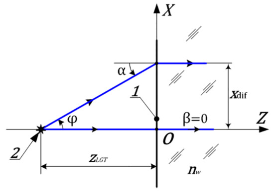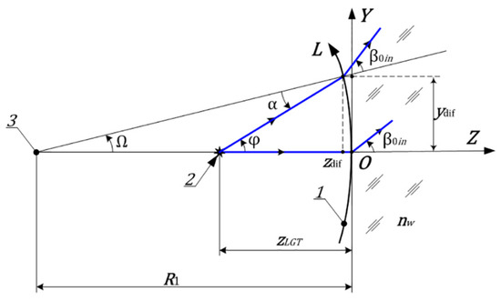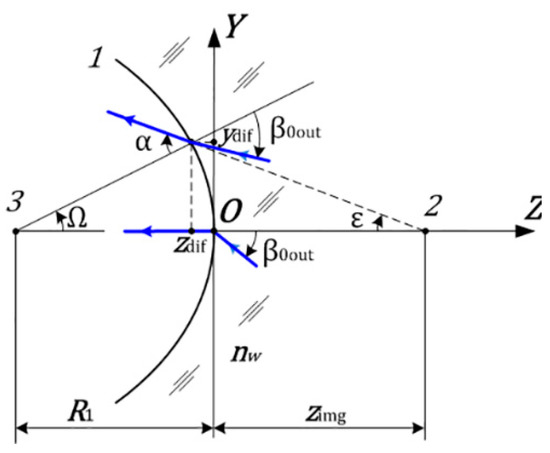 The relation (8) derived above is valid for the meridional plane. Let us consider the path of rays in the sagittal plane, in which the waveguide under consideration is a plane-parallel plate. To in-couple rays from the source into the waveguide without aberrations, we need the rays to enter the waveguide in the sagittal plane along the normal to the waveguide surface (Figure 5).