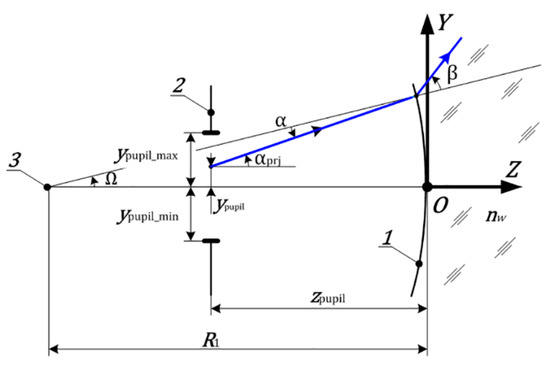 The mutual arrangement of the projector’s pupil, the waveguide and the path of rays in the meridional plane are shown in Figure 6. Let the projector’s exit pupil be located at a known distance from the waveguide, , the pupil size is , and the angular field is .
