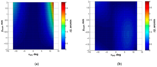 The value of the angular error for in-coupling of radiation is shown by a colored histogram in this figure. From Figure 7a, it can be seen that near αprj = 0° the error of ray in-coupling is zero (no aberrations) for any ypupil. However, for some rays with FOV directions of 10–12°, this error is not equal to zero and reaches a value of about 3.5–4 arcmin. As a result of the optimization (Figure 7b), there was a significant (3–5 times) decrease in the angular errors of in-coupling angles for those rays. However, the error for angles, close to the normal, remained the same or increased insignificantly and did not exceed ~0.8 arcmin. At the same time, it is known from the literature [12] that human eye resolution is ~1–2 arcmin, which allows us to evaluate the optimization result as successful.