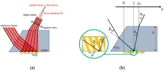 Based on the prerequisites described above and using the obtained law of variation of the periods of the in-coupling and out-coupling HOEs, the parameters of the optical setup for recording the HOEs were calculated: the focal length and position of the cylindrical lens, as well as the convergence angle of the recording beams. Figure 11 shows the path of rays in a prism (Figure 11a), and a set of symbols used in the calculations (Figure 11b).