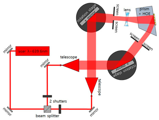 The HOEs were recorded in a two-ray interferometer. The scheme of recording is shown in Figure 12. A single-frequency TEM00 DPSS laser Cobolt Bolero with vertical polarization and a wavelength of 639.6 nm was used as a radiation source. In the interferometer, the initial laser beam was divided into two rays with a ratio of 50:50 by using a beam-splitting cube. After the beam-splitting cube, there were electromechanical shutters that ensured the simultaneous opening of the rays for a given time interval with an accuracy of 0.1 s. Then each of the rays passed through the telescope with a magnification of ≈100× to increase the aperture of the recording beams. A central part, 30 mm in diameter, with uniform intensity, was cut out from each beam. The beams were converged at a given angle using mirrors mounted on electromechanical turntables (Newport URS100BCC). A glass prism was installed in the region of beam convergence, which ensured the recording of TIR holograms in a photopolymer film laminated on it. A diverging cylindrical lens was installed in the object beam in such a way that its focus was located at the calculated distance S from the prism. The radiation power density in each channel in the recording region was ≈ 0.5 mW/cm2. The exposure time varied from 10 to 12 s, which enabled achieving a diffraction efficiency of 10–15% when readout by a non-monochromaic projector was used in the present work.