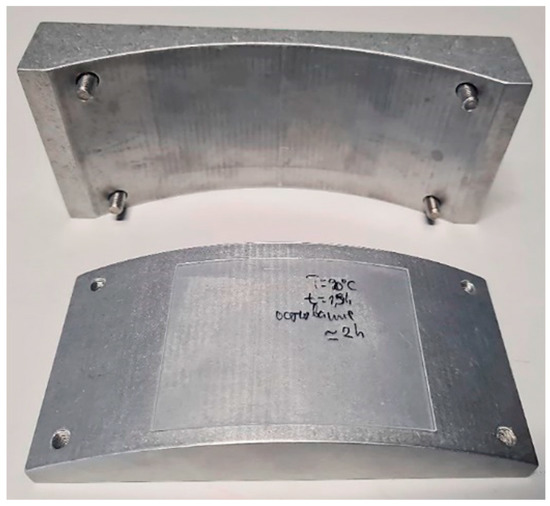 The waveguides were fabricated using a sheet of PMMA with a thickness of 1 mm. From the initially flat sheets, waveguides of the required dimensions and shape were cut out. The waveguides were covered with polyethylene on both sides to prevent damage to the surfaces. Then, the workpieces were placed in a mold, i.e., the waveguide was clamped between two cylindrical metal parts with the required curvature radius (Figure 13). The mold was placed in an oven, where it was heated to a temperature of 90 °C and kept at this temperature for ≈2 h. Then, the oven was switched off, remaining closed, and the workpiece slowly cooled down for ≈10 h. After cooling and removing from the mold, the waveguide was used for prototyping.