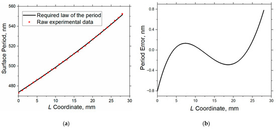 A CrystaLaser DL445-025 laser with a wavelength of 445 nm was used as a readout radiation source; a rotation sensor (LIR-510M.01, with the declared accuracy of <0.025°) was used to control the rotation angle. The estimated accuracy of measuring the surface period was ± 1 nm. An HOE was certified at 29 points along the direction of the grating vector with a step of 1 mm between measurements. Then, the period values obtained from experimental measurements of the diffraction angles (Figure 14a), were approximated by a fourth-order polynomial in the MatLAB software, which made it possible to reject erroneous measurements and improve the accuracy of the measured dependence. The obtained function was subtracted from the required law of variation of the period (Figure 14b). From the above results, it follows that in the experiment it was possible to obtain an HOE with a maximum deviation of the surface period from the required values in the range of ± 0.8 nm. Thus, it can be seen that in the experimentally recorded HOEs, the law of variation of the period is close to the calculated one. The largest discrepancy between the calculated and experimentally implemented periods is observed for the end parts of the HOEs. Then, the difference between the diffraction angles for the measured and required distributions of the periods of the HOEs over the aperture was found using Formula (18). The estimate showed that the detected error in the period leads to a deviation in the propagation angles of the out-coupled rays < 0.5 arcmin, which is an acceptable result for observing systems.