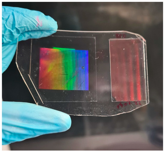 The recorded in-coupling and out-coupling HOEs were laminated onto prepared curved waveguides. A prototype of a fabricated waveguide is shown in Figure 15. We made such waveguide prototypes for red, green and blue colors of a virtual image.