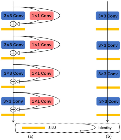As shown in Figure 5a, the RepVGG module uses a multi-branch structure consisting of 3 × 3 convolutional kernels, 1 × 1 convolutional kernel, and identity branches in the training phase. It enhances the model’s ability and efficiency of extracting feature information by connecting the different perceptual fields obtained from each branch to an additive block and then extending the network downward and doing the same operation. When inference is made, the RepVGG model transforms the training model into the inference model, as shown in Figure 5b. The inference model is equivalent to the structure of multiple VGGs directly connected, which improves the inference speed of the model. Meanwhile, to improve the detection accuracy of the model, we used SiLU to replace the previous activation function ReLU.