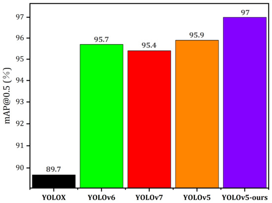 We experimentally compared the improved YOLOv5 algorithm (YOLOv5-ours) with the more influential one-stage algorithms YOLOv5, YOLOv7, YOLOv6, and YOLOX in recent years, and the results are shown in Table 4 and Figure 7. Our improved YOLOv5 improved the average accuracy by 1.1% compared to the original model. It increased the precision and recall of the welding hole by 1.5% and 2%, respectively, and the recall of bulge by 1.6%. Despite the larger computation of the model, the inference speed remained within 2 ms, and the fps reached 270, which is fully capable of real-time industrial inspection. As shown in Figure 7, YOLOv5-ours had the highest average accuracy compared with the other four YOLO algorithms. This demonstrates that our improved model has good detection performance and can meet the industrial requirements for detecting the laser welding defects of a lithium battery pole.