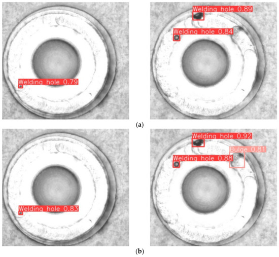 Additionally, we compared the defect detecting effects of the original YOLOv5 and our improved YOLOv5 algorithm, and the results are shown in Figure 8. Obviously, YOLOv5 had a low confidence level for the detection welding hole, and missed detecting the bulge defects. Relatively, the YOLOv5-ours model not only successfully detected all of the defects, but also improved the confidence score. The results indicate that our improved algorithm is good at feature extraction and can better meet the industrial requirement of a low miss inspection rate for detection tasks.
