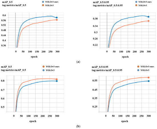 The ablation experiments were conducted with the YOLOv5 model as the baseline, and the marked tick represents the addition of this improvement item. From the experiments on MS COCO, it can be found that when the network model was replaced with the SPPSE module, mAP@0.5 increased by 1.9%, mAP@0.5:0.95 rose by 1.6%, and the average detection accuracy for small targets rose by 0.6%, indicating that SPPSE had the effect of focusing on small targets, and could thus increase the detection accuracy; in addition, the number of model parameters increased by 6.4 million (M) and the fps decreased from 357 to 323. After replacing the convolutional kernel of the backbone network to 6 × 6, mAP@0.5 increased by 0.4% and mAP@0.5:0.95 increased by 0.9%, the detection accuracy of small targets increased by 0.6%, the number of parameters increased by 4.8 M to 18.4 M, and the fps became 313, indicating that after expanding the convolutional kernel of the backbone network, its feature extraction ability was enhanced and the average detection accuracy was also improved; meanwhile, the complexity of the model did not increase significantly, and it could still achieve real-time detection. When the RepVGG module was added to the network model, mAP@0.5 and mAP0.5:0.95 increased by 0.5% and 0.8%, respectively, and the small target detection accuracy improved by 0.4%, the number of parameters reached 21.5 M, and the fps decreased by 10 to 303, indicating that the RepVGG module can increase the feature extraction ability of the detection head and then increase the average detection accuracy while improving the model’s inference speed. Finally, after replacing the loss function with SIoU, mAP@0.5 and mAP@0.5:0.95 both improved by 0.2%. Although the average accuracy increase was not as good as other improvements, the small target detection accuracy was improved by 0.6%, the number of parameters and fps of the model remained unchanged, which indicates that SIoU can improve the detection accuracy without increasing the complexity of the model. The ablation experiments on the PASCAL VOC dataset can also demonstrate that each improvement to the original YOLOv5 model can improve the detection accuracy of the algorithm. Figure 9 more starkly shows the improvement in detection accuracy after we improved the model.