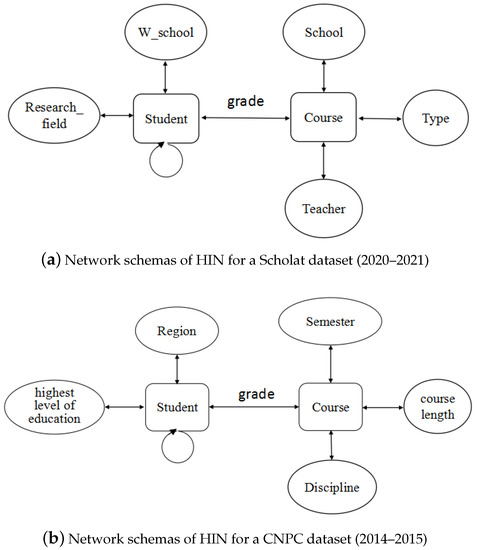 In natural and social systems, interacting components form interconnected networks, which can be referred to as complex information networks. These networks are homogeneous, containing the same type of objects and links; however, most real systems contain multiple types of interacting components, and as such can be modeled as heterogeneous information networks (abbr. HIN). HIN consist of multiple types of nodes and links, and have been proposed as a powerful information modeling method [24] able to naturally model complex objects and their rich relations. Figure 1 shows the HIN of two course datasets. HIN embedding, which aims to embed multiple types of nodes into a low-dimensional space, has received growing attention as well. Heterogeneous information networks can naturally model complex objects and their rich relations in recommender systems, as in such systems objects are of different types and links among objects represent different relations. In [25], the authors propose an approach to evaluate the similarity of items or users in HIN. In [26], the authors proposed an MF-based recommendation method that uses the entity similarity calculated on a heterogeneous information network based on a meta-path algorithm. In [27], a collaborative filtering method on a weighted heterogeneous information network was proposed. This method is constructed by connecting users and items with the same rating. It can flexibly integrate heterogeneous information to make recommendations through weighted meta-paths and weighted integration methods. In order to take full advantage of the relationship heterogeneity in information networks, the authors of [28] introduced metapath-based latent features to represent the connectivity between users and items along different types of paths. The network embedding approach is more resistant to sparse and noisy data. Considerable research has been done on representation learning for HIN. Broadly speaking, the existing works on HIN embedding can be categorized into four types: random walk-based methods, decomposition-based methods, deep neural network-based methods, and task-specific methods. In [6], an HIN embedding-based approach for recommendation was proposed. In [29], the authors exploited the attention-guided walk model in a heterogeneous information network to selectively sample discriminative attributes and representative explanation meta-paths to explain the recommendations.