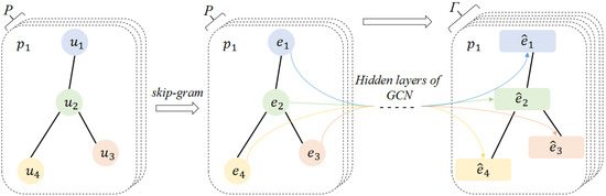 Using the method in the previous section, the embeddings generated under each meta-path in the heterogeneous graph can be obtained. In order to gather more neighbor information to improve the learning effect of node feature representation, this module uses GCN to aggregate the information of neighbor nodes to generate more meta-path node embeddings. As Figure 2 shows, a GCN model inside is used to achieve this task; that is, more meta-path node embeddings are simulated by using GCN to aggregate neighbor embeddings for the node embeddings of the initial meta-path, thereby generating new node embeddings. The schematic of this process is shown in Figure 3.
