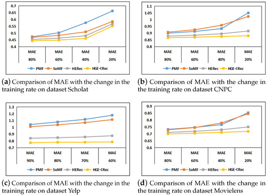 Figure 5 shows the results on the four datasets in terms of MAE. Compared with the baselines, the line when using HGE-CRec is gentler in terms of MAE as the training ratio changes from 80% to 20%. In other words, the MAE growth of HGE-CRec is lower than the other three baselines. The same can be observed for all of the datasets.